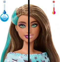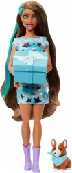 BARBIE z dolgimi lasmi in turkiznimi prameni, bleščeča obleka z vijoličnimi zvezdami in modni čevlji. Priložen je tudi ljubek kužek z rutico.