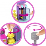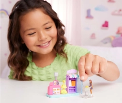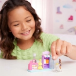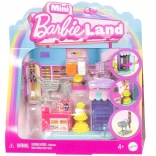 Mini punčka BARBIE (pribl. 3,5 cm) se upogiba v pasu, lahko sedi ali se nagne k pultu in stoji na podstavku v obliki srca, ki se prilega drugim hiškam, vozilom in setom serije MINI BARBIE LAND. Igra naravno razvija domišljijo, fino motoriko in socialne veščine.