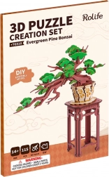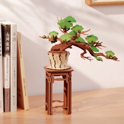 Ta podrobno izdelan bonsaj na elegantnem stojalu s teksturo razpokane zemlje navduši s prepletenimi vejami in strukturiranimi listi, ki prikličejo moč in vztrajnost zimzelenih dreves. Sestavljanje spodbuja fino motoriko, prostorsko razmišljanje in potrpežljivost, zato je odlično za sprostitev in razvoj spretnosti.