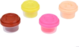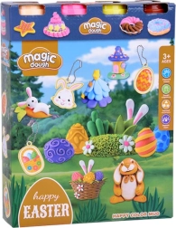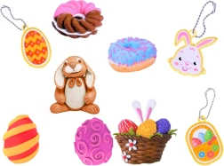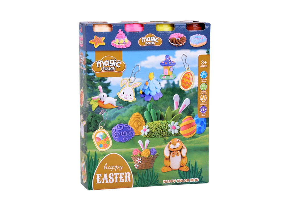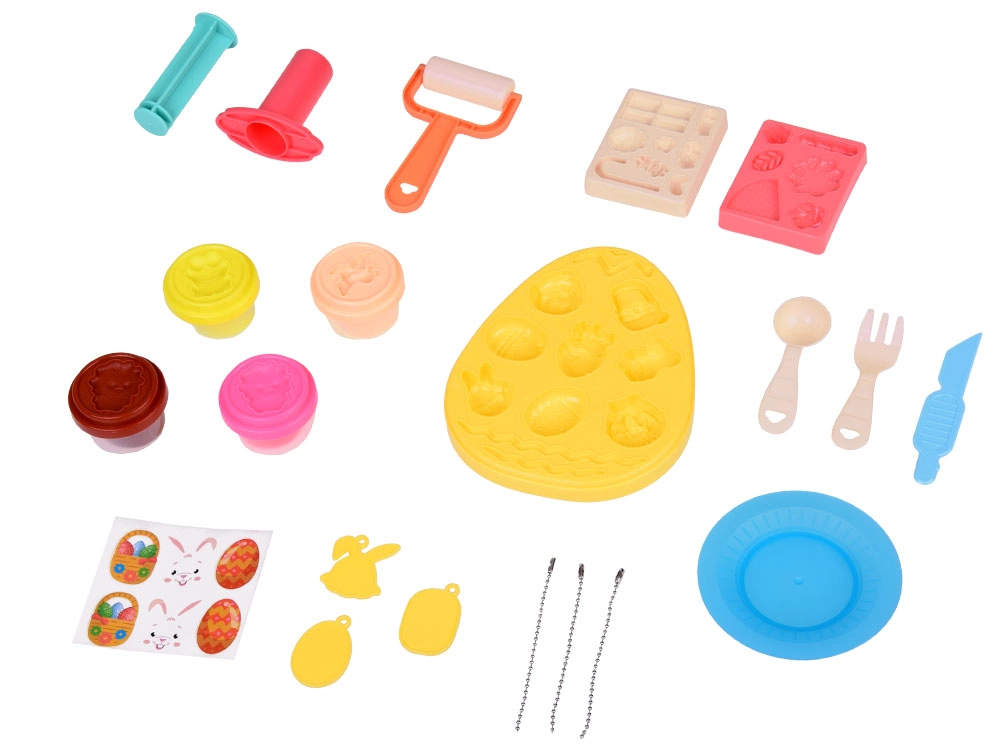 Ta barvit ustvarjalni set prinaša otrokom vse, kar potrebujejo za izdelavo prikupnih velikonočnih okraskov. Z 4 lončki modelirne mase in pametnimi pokrovčki, ki služijo kot modelčki z živalmi, v hipu nastanejo zajčki, piščančki in okrašene pirhe. Velika jajčasta forma ponuja pestro paleto motivov (zajček, korenček, jajčka, piščanček, košarica), dopolnjujeta pa jo še dve dodatni formi z listki, cvetki, oblački in sladkarijami.