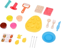 Ne manjkajo praktični pripomočki za realistično igro peke in pogrinjka: valjar, krožniček, nož, vilice in žlička. Ročni iztiskač ustvari iz modelirne mase zabavne zvezdaste oblike. Otroci lahko izdelke okrasijo s samolepkami in jih pritrdijo na 3 dvostranske obeske (zajčkova glavica, košarica, jajce) – idealno kot prisrčna darilca.