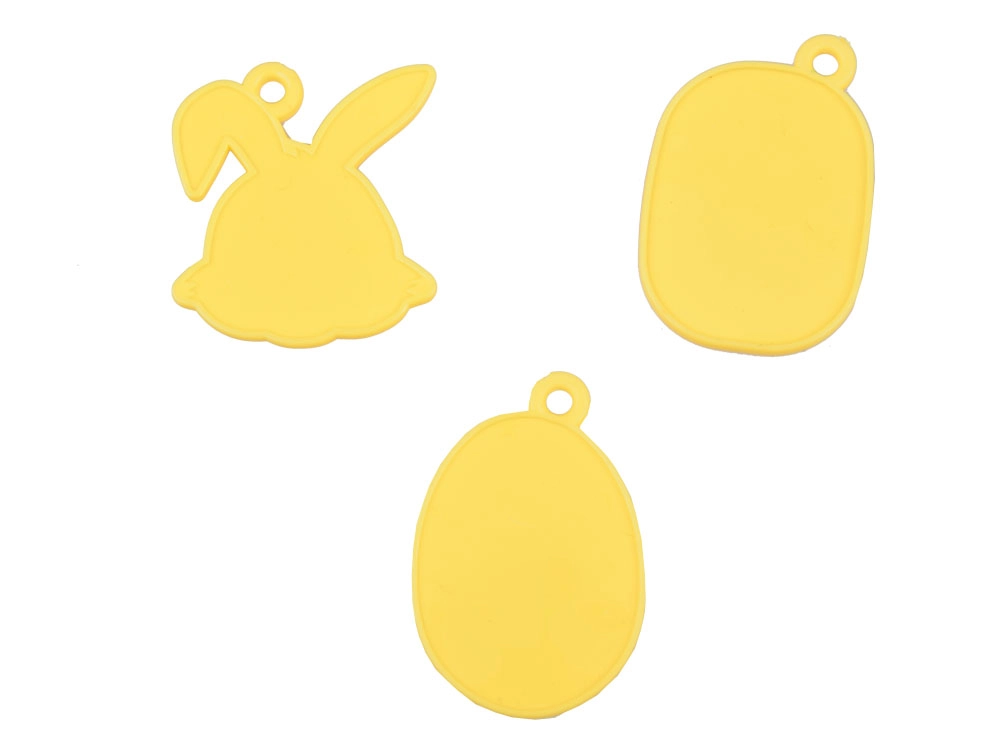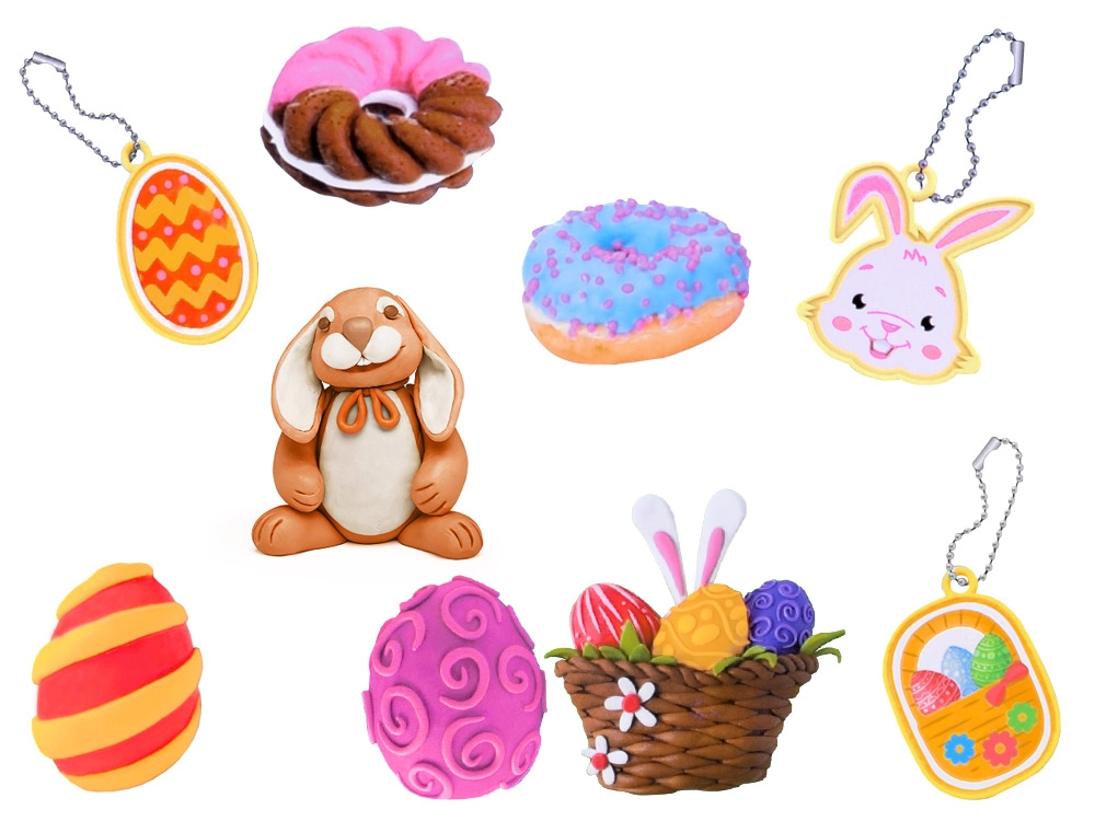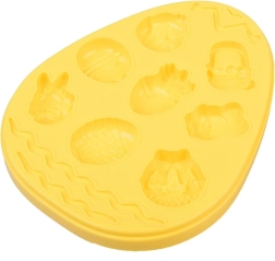 Veliko jajce z motivi zajčka, košarice ali jajčk ter še dva dodatna modela z listki in cvetovi omogočata otrokom izdelavo raznolikih okraskov iz modelirne mase.