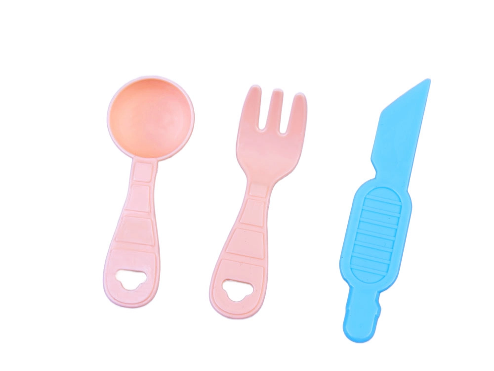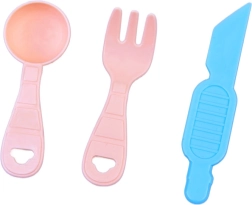 Valjar, krožniček, nož, vilice in žlička podpirajo igro kuhanja ter olajšajo oblikovanje in postrežbo končanih izdelkov.