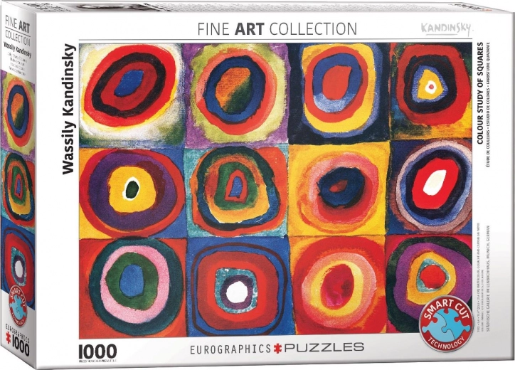 Sestavljanka EUROGRAPHICS 1000 koščkov z barvno študijo kvadratov. Nestandardni izsek za višjo težavnost, živahne barve, dimenzije po sestavitvi cca 67,63 × 48,89 cm.