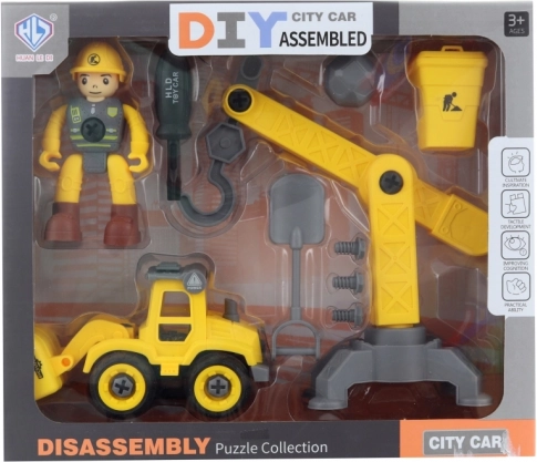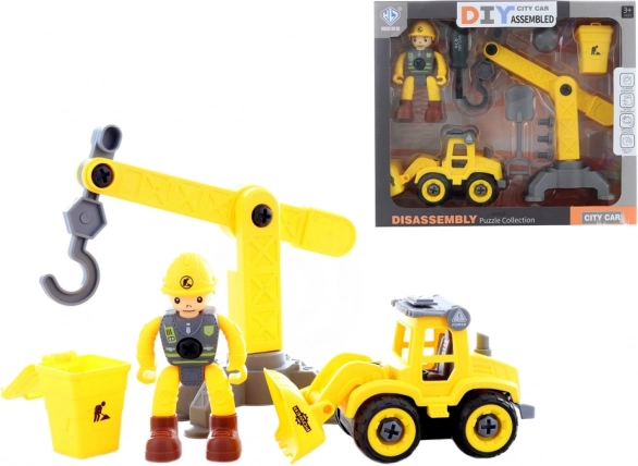 Zabavna plastična konstrukcijska igrača za male graditelje od 3 let naprej. Set vsebuje nakladač, žerjav, figurico delavca, smetnjak in izvijač – vse je na vijake za urjenje fine motorike in domišljije.