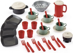 Velika prozorna torba s štirimi krožniki, priborom, kozarčki, skodelicami s krožnički, čajnikom, posodico za sladkor, cedilom in loncem s pokrovom. Odličen otroški komplet za zabavno igro.