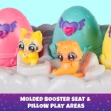 Doživite edinstven trenutek izleganja z večpaketom Hatchimals Oblak z neonsko mavrico. Le odstranite dudice iz jajčk, napolnite stekleničko z vodo in jo nežno iztisnite v jajčka – v nekaj sekundah se začnejo pojavljati nove figurice: Bunnypie, Puppadee in Narwing. Izven jajčka vas čakata tudi Kittingale in Foxstritch. Vse lahko razstavite v pomladni košarici z oblikovanim sediščem in blazinico.