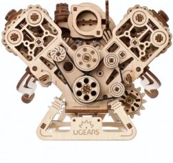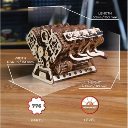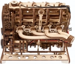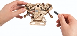 Leseni mehanski model motorja V8 zvesto simulira delovanje pravega osemvaljnika: osem valjev z ritmičnim gibanjem batov, 16 ventilov, ki jih upravljajo odmične gredi, razvod z nastavljivo verigo (32 členov) in dodatki, poganjanimi z rebrastim jermenom. Zahvaljujoč napajanju prek USB‑C ali ročnemu vrtenju boste uživali v realističnih mehanskih gibanjih in bolje razumeli principe batnega motorja z notranjim zgorevanjem.