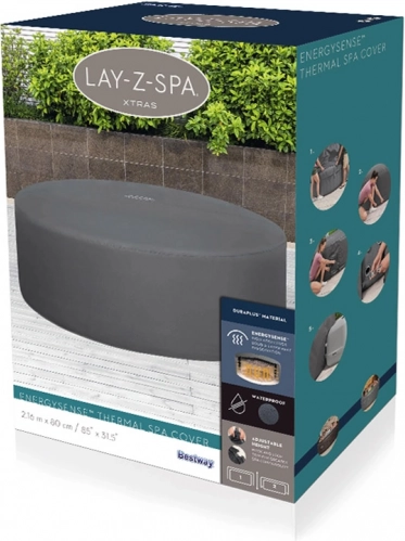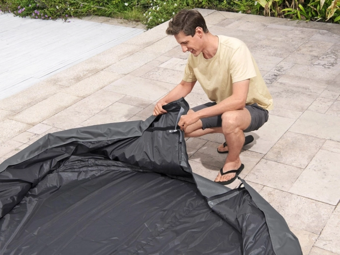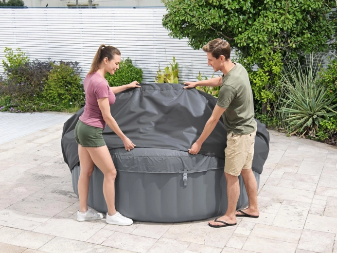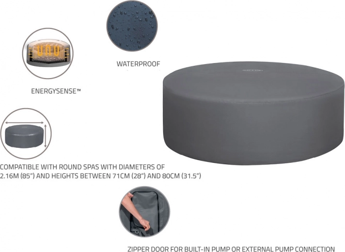 Montaža je hitra in intuitivna. Nastavljiv obodni pas z varnostnimi sponkami zagotovi čvrsto pritrditev, medtem ko integrirana zadrga omogoča brezhibno priključitev na črpalko brez potrebe po snemanju pokrova. Pokrov je združljiv z modeli Lay‑Z‑Spa St. Moritz, Monaco, Santorini HydroJet Pro in drugimi okroglimi masažnimi bazeni s premerom 216 cm.