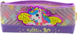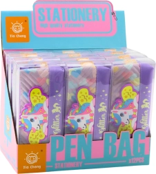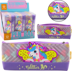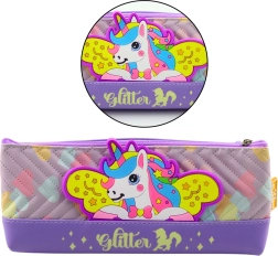 Vijolična peresnica z motivom enoroga, idealna za shranjevanje šolskih potrebščin. Mehak, trpežen in varen material ustreza standardom CE in EN71.
