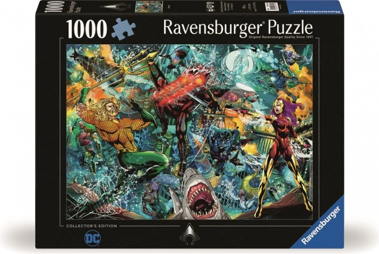Sestavljanka RAVENSBURGER Aquaman s 1000 kosi. Kakovosten izrez, žive barve in dimenzije po sestavi približno 70 × 50 cm. Odlična izbira za ljubitelje DC in navdušence nad sestavljankami.