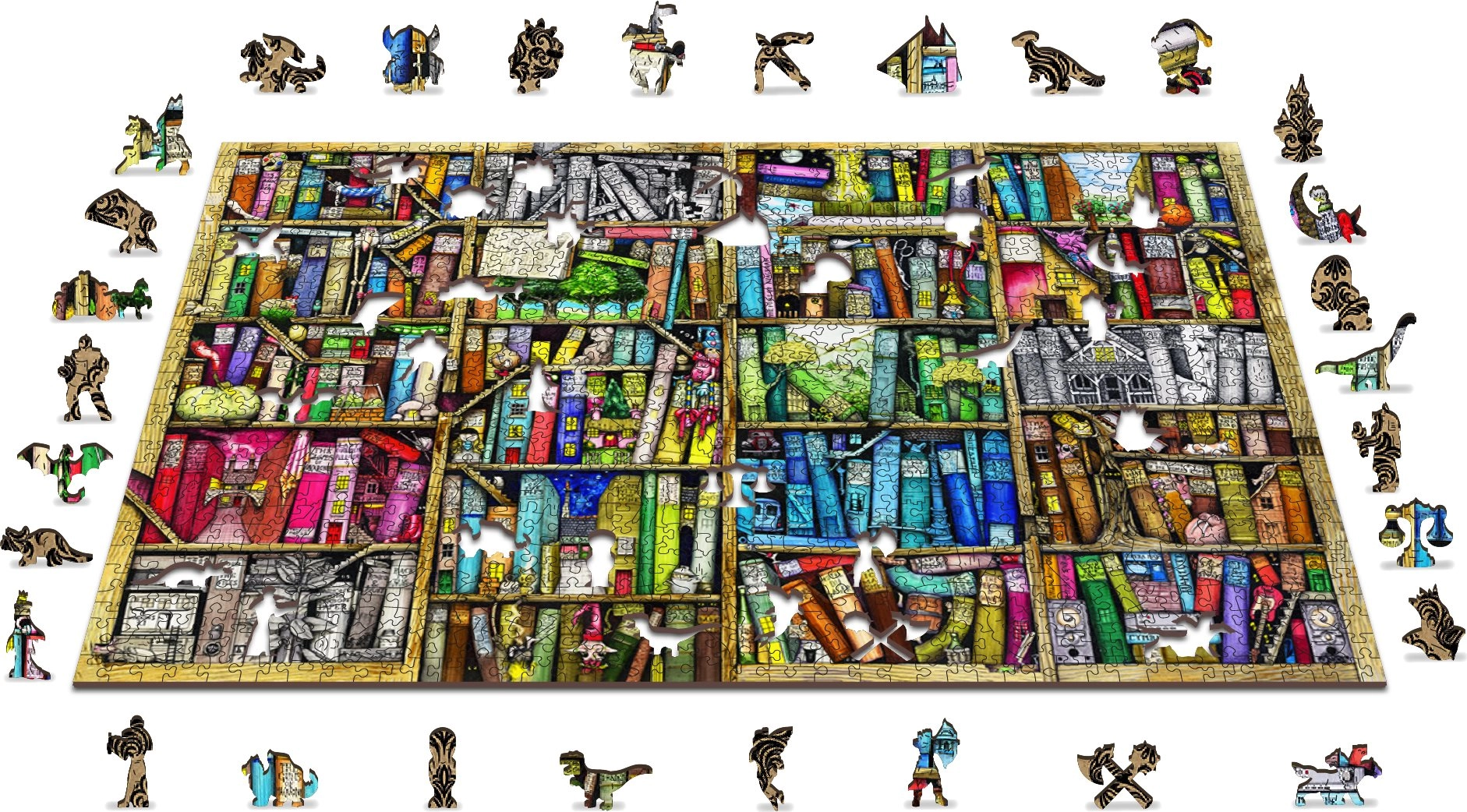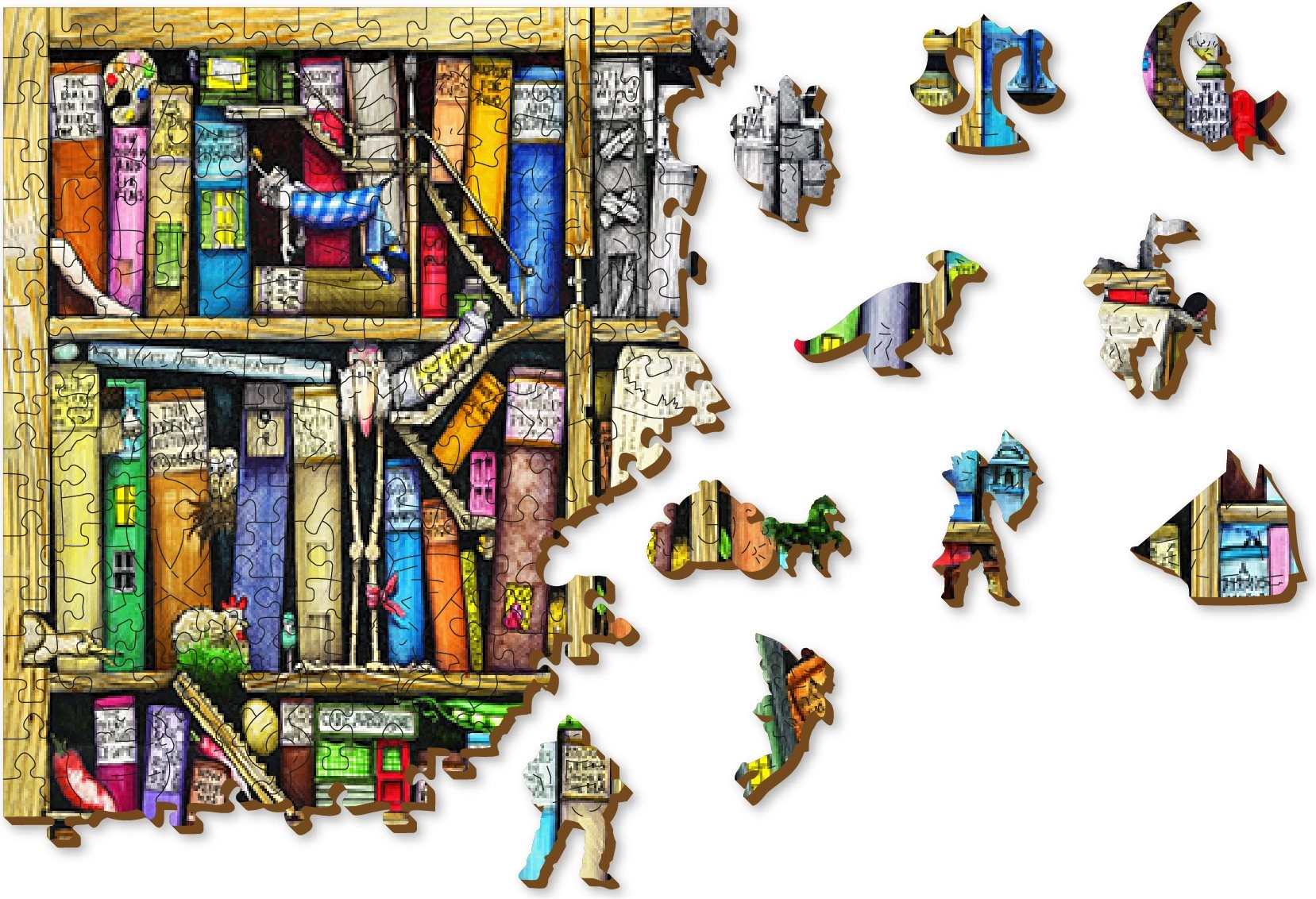 Preizkusite zabavne in z izzivi nabite sestavljanke WOODEN CITY s tematiko polic s knjigami. Ta lesena sestavljanka je izrezana z laserjem in ponuja posebej oblikovane koščke, ki navdušijo ne le s svojo izvirnostjo, temveč tudi z natančno izrisanimi detajli.
