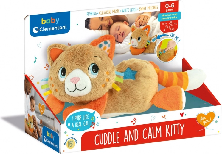Ta žametno mehka plišasta mucka znamke CLEMENTONI BABY je zasnovana tako, da otrokom nudi tolažbo in jim pomaga zaspati. Vibracije realistično posnemajo mačje predenje, kar spodbuja sprostitev, medtem ko izbor pomirjujočih zvokov (klasična glasba, beli šum in nežne melodije) ustvarja prijetno vzdušje za spanje.