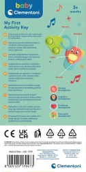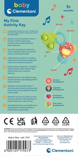Interaktivni ključek BABY CLEMENTONI je zasnovan za zabavo in razvoj otroka v prvih mesecih življenja. S prijetnimi melodijami in zvoki razvija slušno zaznavanje, medtem ko mehko grizalo prinaša olajšanje pri izraščanju zobkov. Barvit dizajn in varni materiali vabijo k raziskovanju ter spodbujajo fino motoriko.