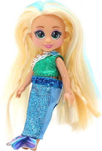 Ta prikupna mini punčka je zasnovana za male ljubitelje domišljije. Ima dolge, barvite lase, ki jih je mogoče zlahka česati in oblikovati, ter očarljiv outfit, navdihnjen z morskimi deklicami. Embalaža v obliki kornetka doda darilni učinek in iz punčke naredi odlično izbiro za nagrado ali majhno presenečenje.