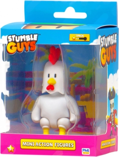 Mini figurica belega petelina z rdečim grebenom in rumenimi nogami v pisani škatlici, idealna za vse igralce Stumble Guys.