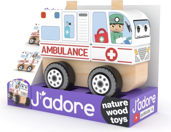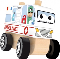Sestavite si svoje leseno reševalno vozilo in pri tem vadite veščine. Barvne kocke se nizajo na 2 trdni paličici na podvozju s kolesi – preprosto sestavljanje korak za korakom spodbuja zbranost in potrpežljivost.