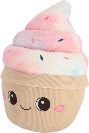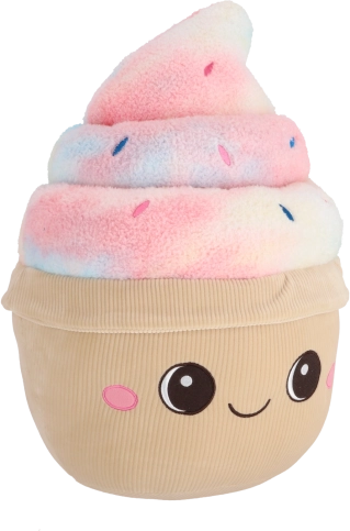 Ta puhast pliškot v obliki cupcakea/soft-serva navduši z nežnimi pastelnimi barvami, veselým nasmeškom in kakovostno izdelavo. Je dovolj velik (43 cm), da je udoben za stiskanje, hkrati pa stilski kot dekoracija otroške sobe, spalnice ali igralnice.