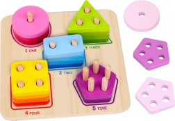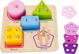 Otroci razvrščajo barvite oblike na prave zatiče in se pri tem učijo šteti 1–5 ter prepoznavati angleška poimenovanja oblik na osnovi.