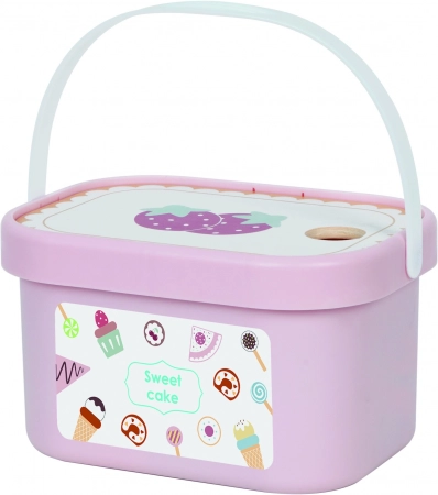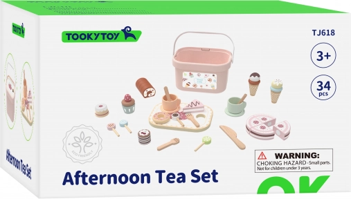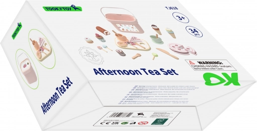 Ta kakovosten leseni set sladic ponuja vse za stilski popoldanski čaj: torto za rezanje, rolado, krof, piškote, makrone in sladoled. Otroci vadijo fino motoriko pri rezanju na porcije in aranžiranju na pladenj, razvijajo domišljijo in komunikacijo pri igri slaščičarne ali čajanke.