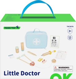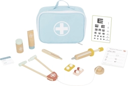 Stetoskop, termometer, injekcija, očesna tabla in drugi pripomočki iz kakovostnega lesa podpirajo varno in domiselno igro.