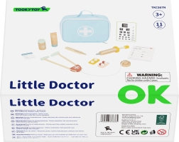 V kompletu je 11 kosov: tekstilni kovček, stetoskop, injekcija, termometer, »zdravila«, tuba z mazilom, steklenička za zdravila, paket zdravniških kart, očesna tabla in zdravniška priponka z imenom. Zaradi preglednega shranjevanja v kovčku je set idealen tudi za potovanja in se zlahka pospravi.