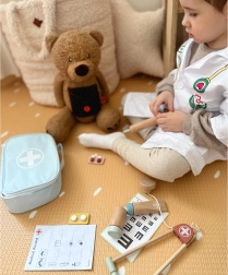 Šik otroški zdravniški kovček skriva vse, kar mali zdravnik potrebuje za skrb za svoje plišaste paciente. Set podpira igro vlog, uči empatije in zmanjšuje strah pred obiskom ordinacije. Vsi deli so izdelani iz kakovostnega lesa in barvani z varnimi, netoksičnimi barvami.