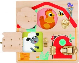 Ta kakovostna lesena manipulativna deska je idealna izbira za smiselno igro. Otroci med raziskovanjem posameznih elementov vadijo prstke, spoznavajo principe odpiranja in zapiranja ter pri tem varno razvijajo svoje sposobnosti. Različni mehanizmi spodbujajo zbranost in podpirajo samostojnost.