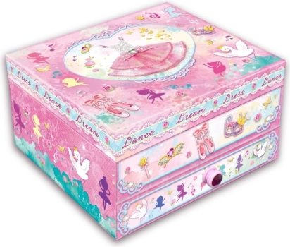 Čudovita glasbena škatlica za nakit z motivom baletke. Po navijanju in odprtju zaigra melodijo. Popolno darilo za male princeske od 6 let. Izdelano iz vzdržljivega kartona.