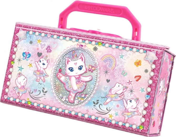 Škatlica za nakit v obliki kovčka je čudovit način za shranjevanje otroškega nakita in drobnih predmetov. Motiv mucke doda škatlici prikupnost, ki jo imajo malčki radi.