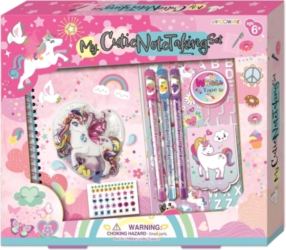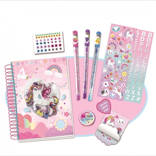 Ustvarite svoj ustvarjalni svet z barvnim kompletom samoroga, ki vsebuje dnevnik, bleščeča dišeča peresa in komplet nalepk za otroke od 6 let dalje.