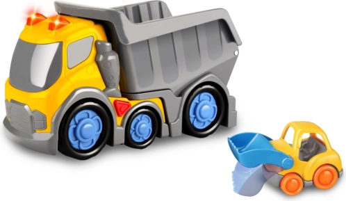 Zabaven set Kiddy Go! prinaša robusten tovornjak velikosti 31 cm in majhen avtomobilček za še več igre. Vozilo ponuja svetlobne in zvočne učinke, aktivirane s tipko na strehi, nagibno kesono in kolesa v prostem teku. 2× AA bateriji sta priloženi. Primerno od 18 mesecev.