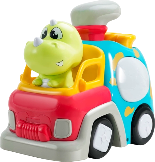 Kiddy Go! avtomobilček z dinozavrom z lučkami in zvoki. Vključuje 3× AA baterije, kolesca v prostem teku, primerno od 18 mesecev. Odlična interaktivna igrača.