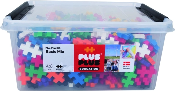 PLUS-PLUS BIG škatla s 600 koščki v osnovnih barvah. Brez ftalatov, iz reciklirane plastike, izdelano na Danskem. Od 1. leta, idealno za skupine.