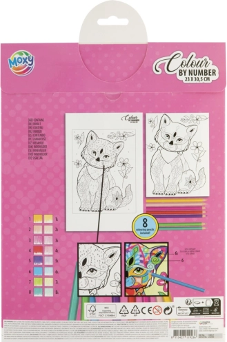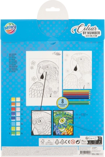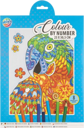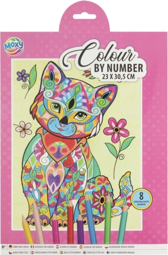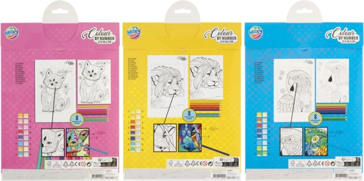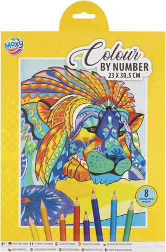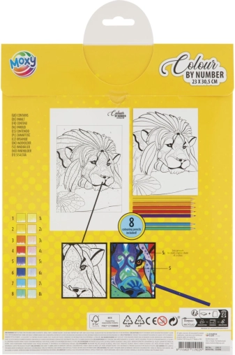 Ta kreativni set prinaša preprost in zabaven način, kako si doma ustvariš impresivno sliko mogočnega leva. Na predlogi so površine označene s številkami; vsaki številki dodeliš barvo iz priloženih 8 barvic in korak za korakom pobarvaš podroben motiv velikosti 23 × 30,5 cm.