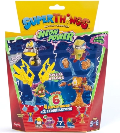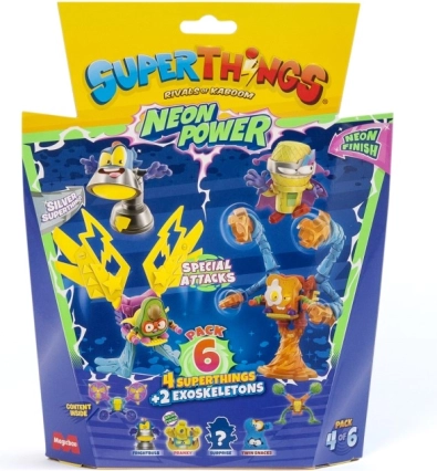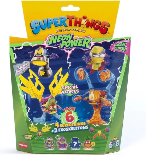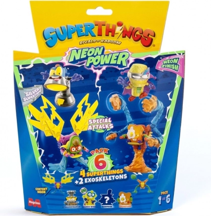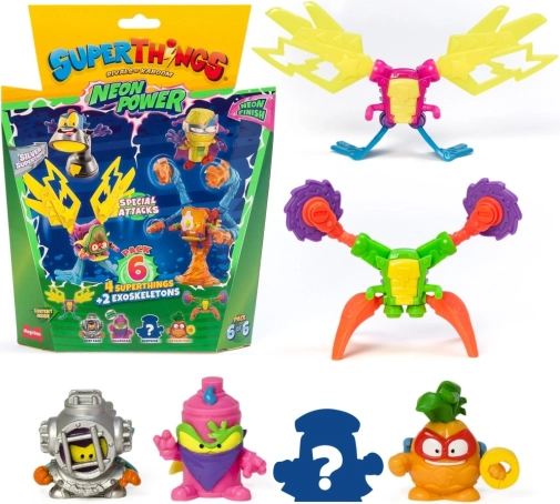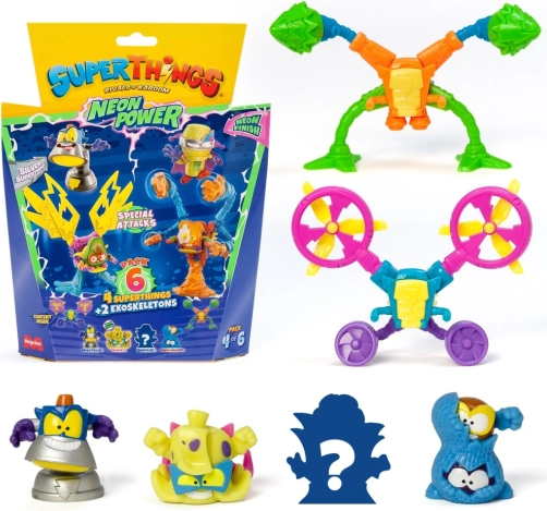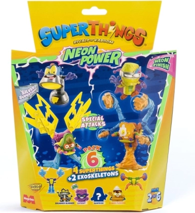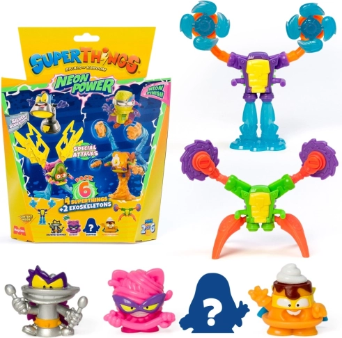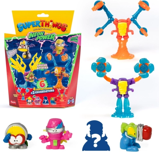 Vstopite v mesto Kaboom in razširite svojo zbirko s SuperThings: Neon Power! Vsako pakiranje prinaša kombinacijo 4 junaških (ali zlikovskih) figuric in 2 eksoskeletov, ki vašim bitkam dodajo moč in slog. Neonska izvedba zagotavlja, da vaši liki izstopajo v vsaki akciji.