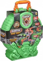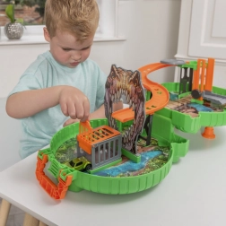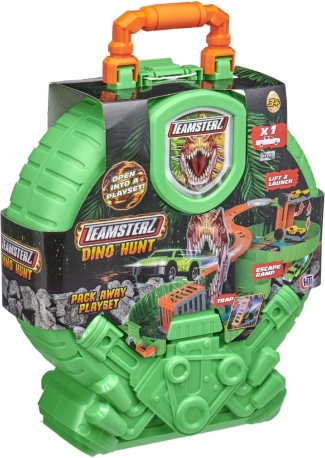 Pripravi se na akcijo s prenosnim dino setom TEAMSTERZ, ki se po odprtju spremeni v tematsko igralno površino s progo, pastmi in klančinami. Otroci lahko spuščajo avtomobilček po klančini, se vozijo mimo dinozavrovih ust in rešujejo vozila iz kletke – vse to v kompaktnem kovčku, pripravljenem na pot.