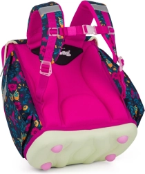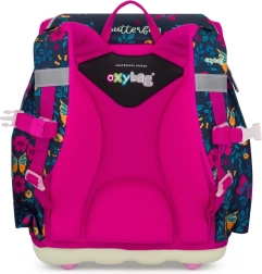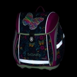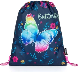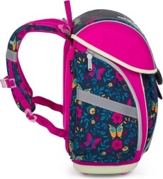 Lahek 3-delni šolski set z motivom metulja vključuje prostoren nahrbtnik, vrečko in peresnico. Nahrbtnik tehta le 970 g, ima ergonomsko oblazinjenje, široke nastavljive naramnice s prsnim trakom, odsevne elemente in magnetno zapiranje. Ponuja prostornino 26 l, praktičen razdeljevalnik in številne žepe – idealna izbira za najmlajše šolarje od 121 cm naprej.
