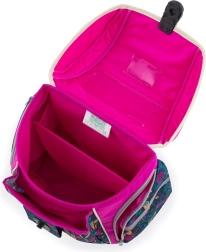 Pametna notranja razporeditev z razdeljevalnikom, velik glavni prostor in številni žepi poskrbijo, da so šolske potrebščine pregledno na svojem mestu. Preprosto magnetno zapiranje olajša vsakodnevno uporabo. Set dopolnjujeta praktična vrečka za telovadbo/copate z zateznimi vrvicami in enonadstropna peresnica z dvema zavihkoma (brez polnila) z gumijastimi zankami ter prozorno folijo za urnik.