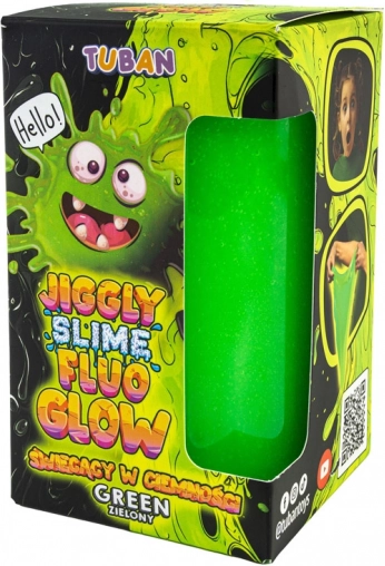 Tuban Jiggly Slime Fluo Glow: zeleni slime 430 g, trese se kot žele, razteguje se kot guma in sveti v temi. Odličen za senzorično zabavo in trike.