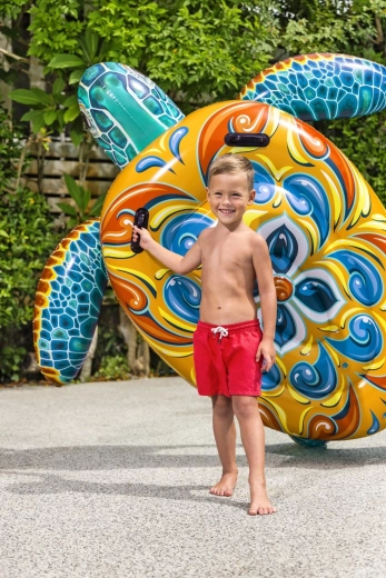 Napihljiva želva Bestway z izrazitim potiskom Majolika je idealna izbira za vodne radosti. Zahvaljujoč velikim dimenzijam 183 × 173 cm nudi udoben prostor za ležanje in vožnjo, medtem ko dva integrirana ročaja zagotavljata zanesljiv oprijem in stabilnost pri sedenju ter med igro.