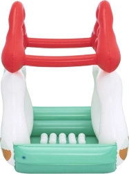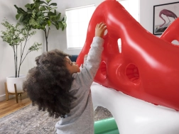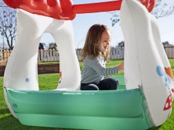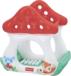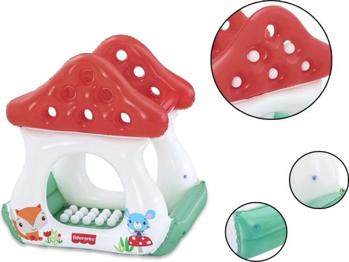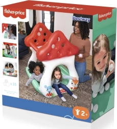 Napenljiva hišica Mušnica je izdelana iz trpežnega PVC-ja, ki zagotavlja stabilnost in varnost. Mehke napihljive stene ščitijo otroka pred poškodbami, široka osnova pa preprečuje prevrnitev hišice. Zaradi kompaktnih mer jo je enostavno postaviti doma ali na prostem, kar ustvarja idealen prostor za igro.