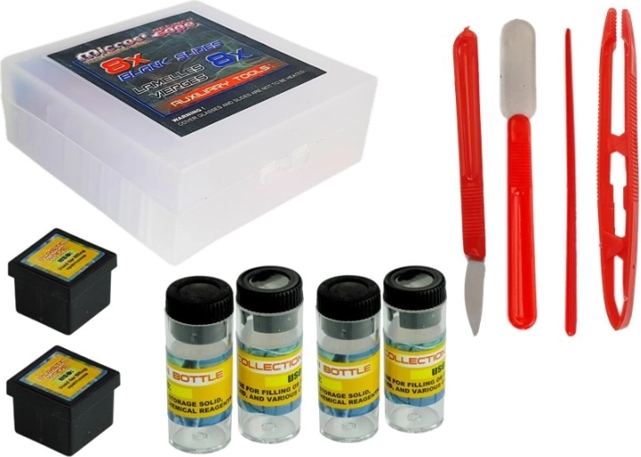 - Bogata oprema: stekelca, pinceta, nožek, lopatica, paličica, epruvete in pripravljen preparat