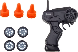 Modri RC avto z aerodinamičnim dizajnom prinaša odlično razmerje med zabavo in vodljivostjo. Pištolski oddajnik na 2,4 GHz ponuja natančno upravljanje naprej/nazaj ter hitro zavijanje levo/desno. Preklapljajte med kolesi z dezénom za zanesljiv oprijem in gladkimi kolesi za spektakularno driftanje na gladki podlagi.