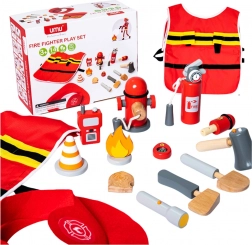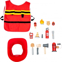 Med elementi kompleta so gasilska čelada, kostum, gasilni aparat ter drugi zabavni dodatki, kot sta megafon in radijska postaja.