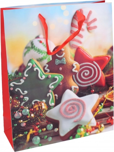Stilska božična darilna vrečka velikosti M v štirih motivih za lepo zapakiranje daril. Dimenzije 26x32x10 cm.