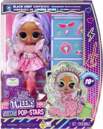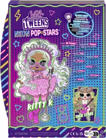 Stopi na oder s Kitty K iz serije L.O.L. Surprise! Tweens Neon Pop Stars – modno punčko, navdihnjeno s pop sceno. Otroci bodo vzljubili njen izrazit videz, dolge vijolično-rožnate lase in bleščeč outfit, ki ga lahko kombinirajo z bogato opremo dodatkov. Zahvaljujoč black light presenečenjem UV svetloba razkrije dodatne učinke in motive, ki igro povzdignejo na novo raven.