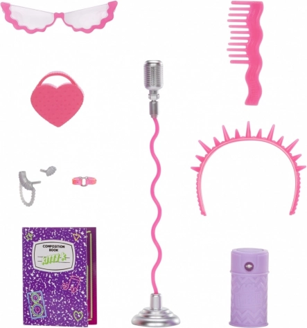 Set ponuja obilo zabave za kreativno igro, styling in nastope na domačem “odru”. Punčka je sklepna za naravno poziranje in skupaj z dodatki, kot so mikrofon, kitara ter očala v obliki srca, navdihuje za neskončne zgodbe.