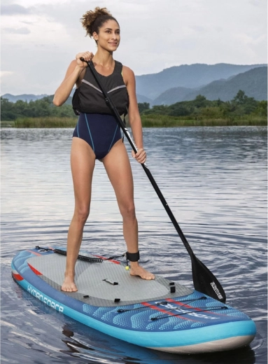 V nekaj korakih ga spremenite v udoben sit-on-top kajak – dovolj je pripeti sedež z naslonom in podnožnik. Integrirani ročaji, elastične vrvi spredaj in zadaj ter zadnji D-obročki omogočajo pritrditev osebnih stvari ali hladilne torbe. Tri odstranljive plavuti izboljšajo smerno stabilnost, hitro-snemljivi varnostni leash lahko nosite na gležnju ali okoli pasu. Dvojno delovna ročna tlačilka poskrbi za hitro napihovanje, po vožnji pa desko zlahka izpraznite in shranite v deluxe nahrbtnik.