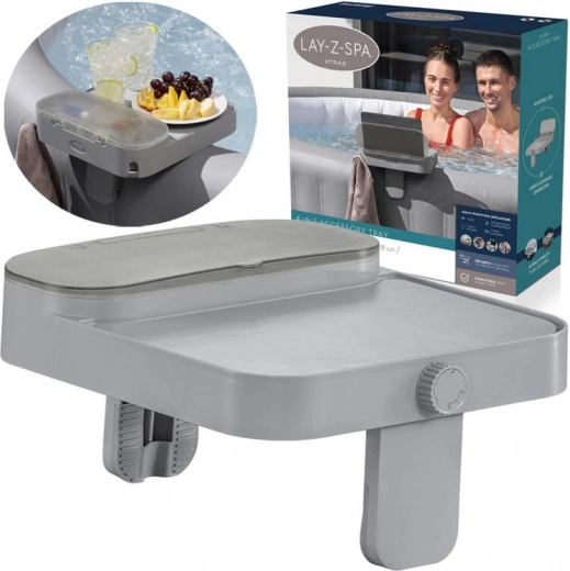 Bestway 4-v-1 večnamenska polica je idealna rešitev za vse, ki želijo povečati udobje pri uporabi masažne kadi Lay-Z-Spa. Z zahvaljujoč tej polici boste imeli vse potrebne dodatke vedno pri roki, sprostitev v vodi pa bo še prijetnejša.